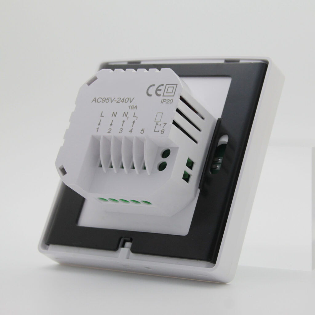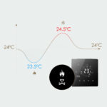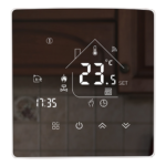 Regulator posiada lustrzany wyświetlacz w kolorze czarnym. Ramka w kolorze czarnym grubości 14 mm dodaje elegancji co sprawia, że termostat na ścianie prezentuje się na prawdę bardzo ładnie, a zarazem dyskretnie. Gwarantujemy, że będziesz zachwycony jego wykonaniem i funkcjami jakie posiada. Wskazanie temperatury z dokładnością co do 0,1 stopnia C – to wyjątek w tej klasie urządzeń.